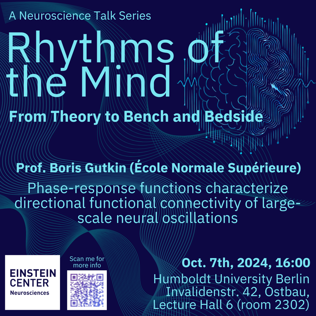 On behalf of the 'Rhythms of the Mind - From Theory to Bench and Bedside' Group, Prof. Boris Gutkin will give a talk titled "Phase-response functions characterize directional functional connectivity of large-scale neural oscillations" as part of the ongoing Student/Postdoc-Run Speaker Series (SPRSS).