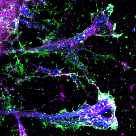 Astrocytes in cell culture (marker protein GFAP in blue), which increase the production of the protein drebrin (magenta) in response to injury. The actin cytoskeleton is shown in green. Photo: Kai Murk/Charité