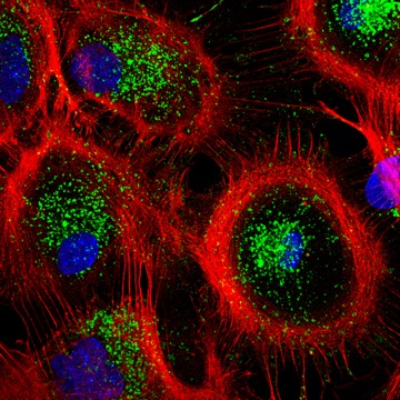 Image of mouse astrocytes showing the actin cytoskeleton (red) and lysosomes (green).