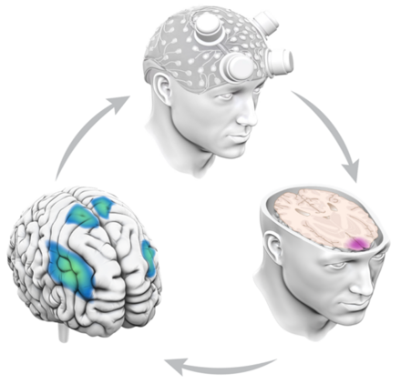 The principle behind the novel bidirectional brain-computer interface: Quantum sensors measure brain activity with superior accuracy while areas of the brain close to the surface or located deeper within the brain are stimulated using interfering magnetic fields. © Charité | Larissa Bulavina and Surjo Soekadar