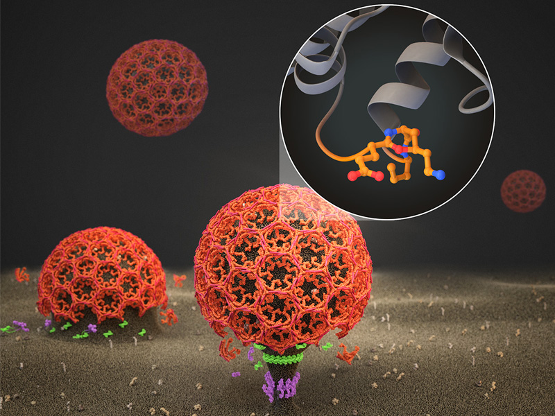 Signal receptor-containing vesicles (red) form on the inside of the cell membrane (brown) and bud off into the cell. The magnifying glass shows molecular details of the active lipid kinase PI3KC2A. This lipid kinase synthesizes signal lipids, which are necessary for this process and the subsequent signal transmission.